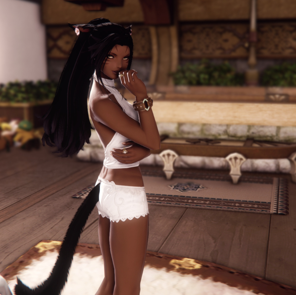Female | 25 yo | 5' 0" height (152.4 cm)S'aedara, S'ae to her friends, was a performer by trade and now the manager of an adult venue called Cat Nipps, can sometimes be found playing at the Quicksand in Ul'dah when she's bored or working her other side hustles.Should you find her feel free to talk to her. (Send a /tell first if that makes you more comfortable) Exceptionally shy at first but once she opens up to you she's very friendly, thoughtful, and caring. It's just hard for her to "make the first move" when meeting new people since she never wants to bother or enter someone else's personal bubble out of respect.
